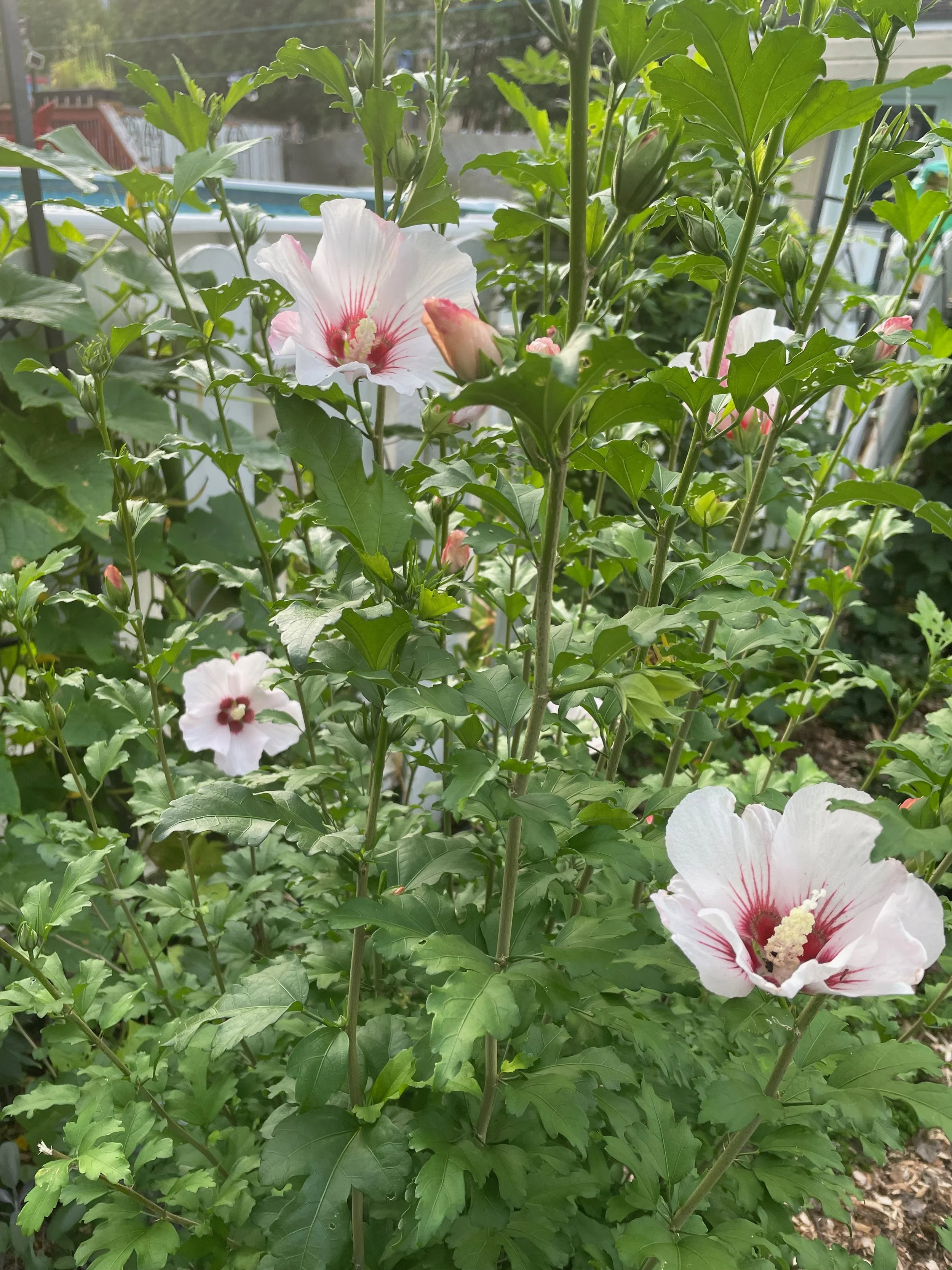 Mid-August already! The end-of-summer flowers are here. It’s not aster or chrysanthemum season, not yet. But the coreopsis are showing off their brilliant yellow skirts; the hibiscuses are gentle giants in my garden, their delicate pink petals tipping up to the sun. The rose of Sharon are full of buds; every day, new flowers grace every limb.